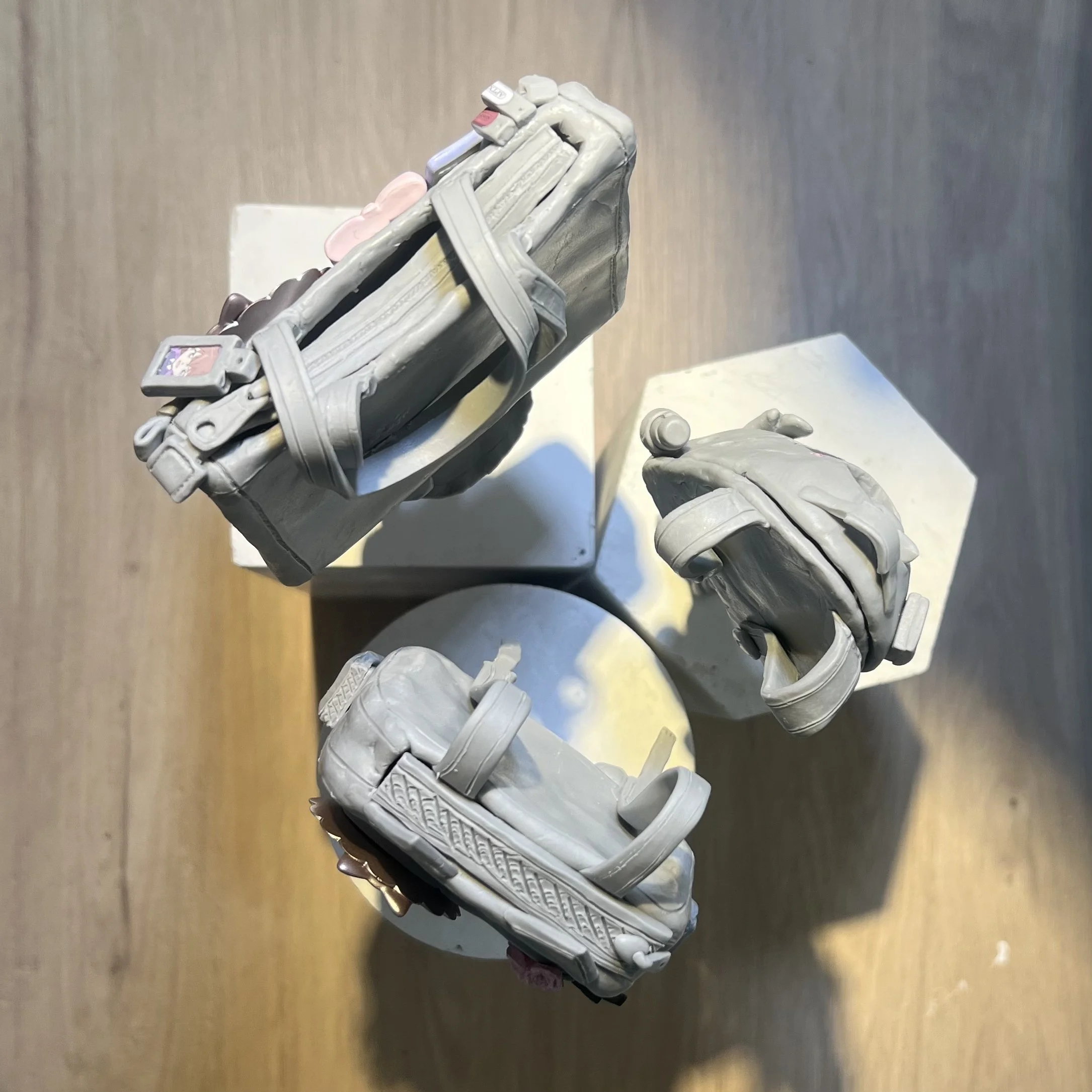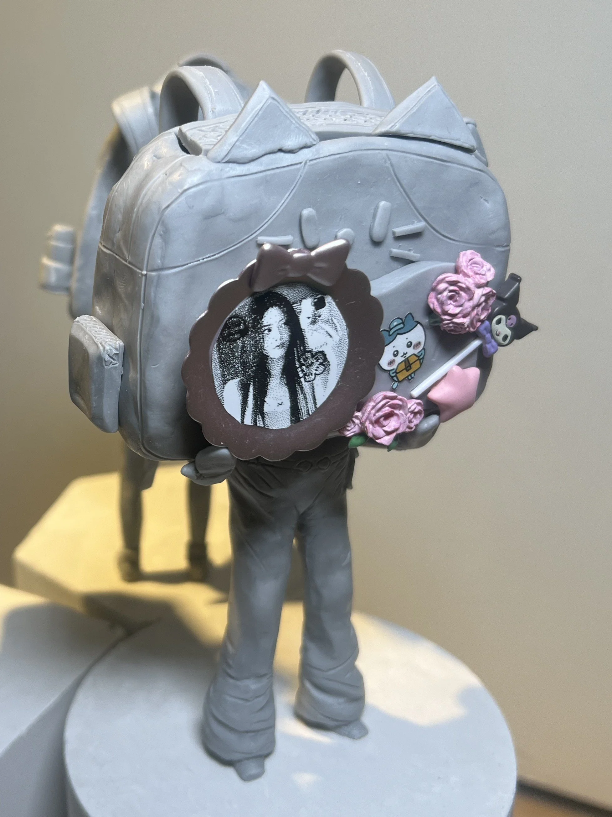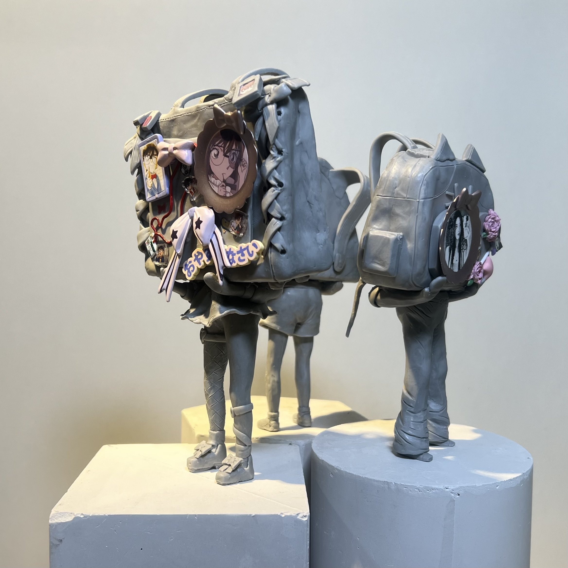 This sculptural work features three female upper-body figures whose heads are replaced by bags. Each bag symbolizes a different type of personal passion, including anime culture, celebrity fandom, and affection for pets. Although each figure reflects a different interest, they are all connected by their heavily decorated bags. The work explores how a carefully customized bag can become an extension of identity, revealing a person’s interests, tastes, and personality to others.